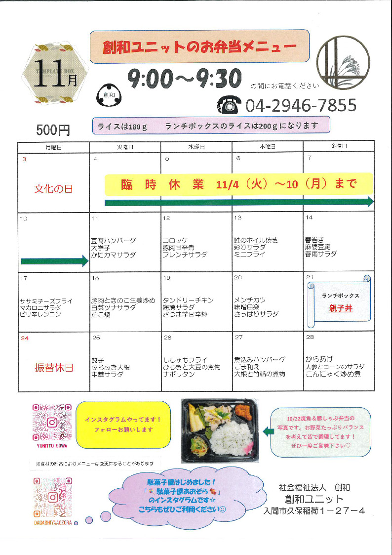 ◆今月のメニュー表![]() |